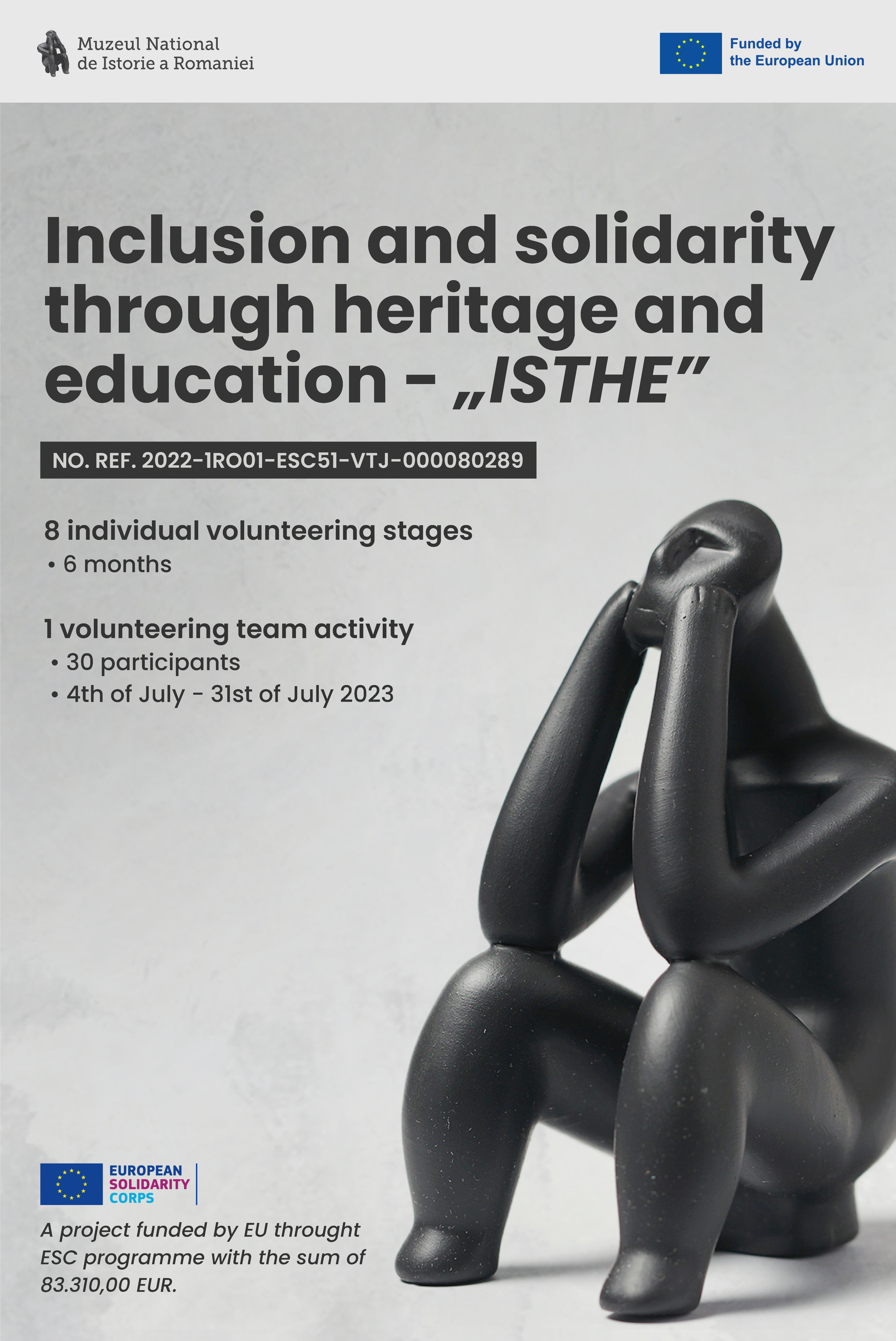 Muzeul Național de Istorie a României (MNIR) anunță lansarea proiectului ”Inclusion and Solidarity through Heritage and Education” (ISTHE), nr. ref. 2022-1-RO01-ESC51-VTJ-000080289, finanțat de Uniunea Europeană...