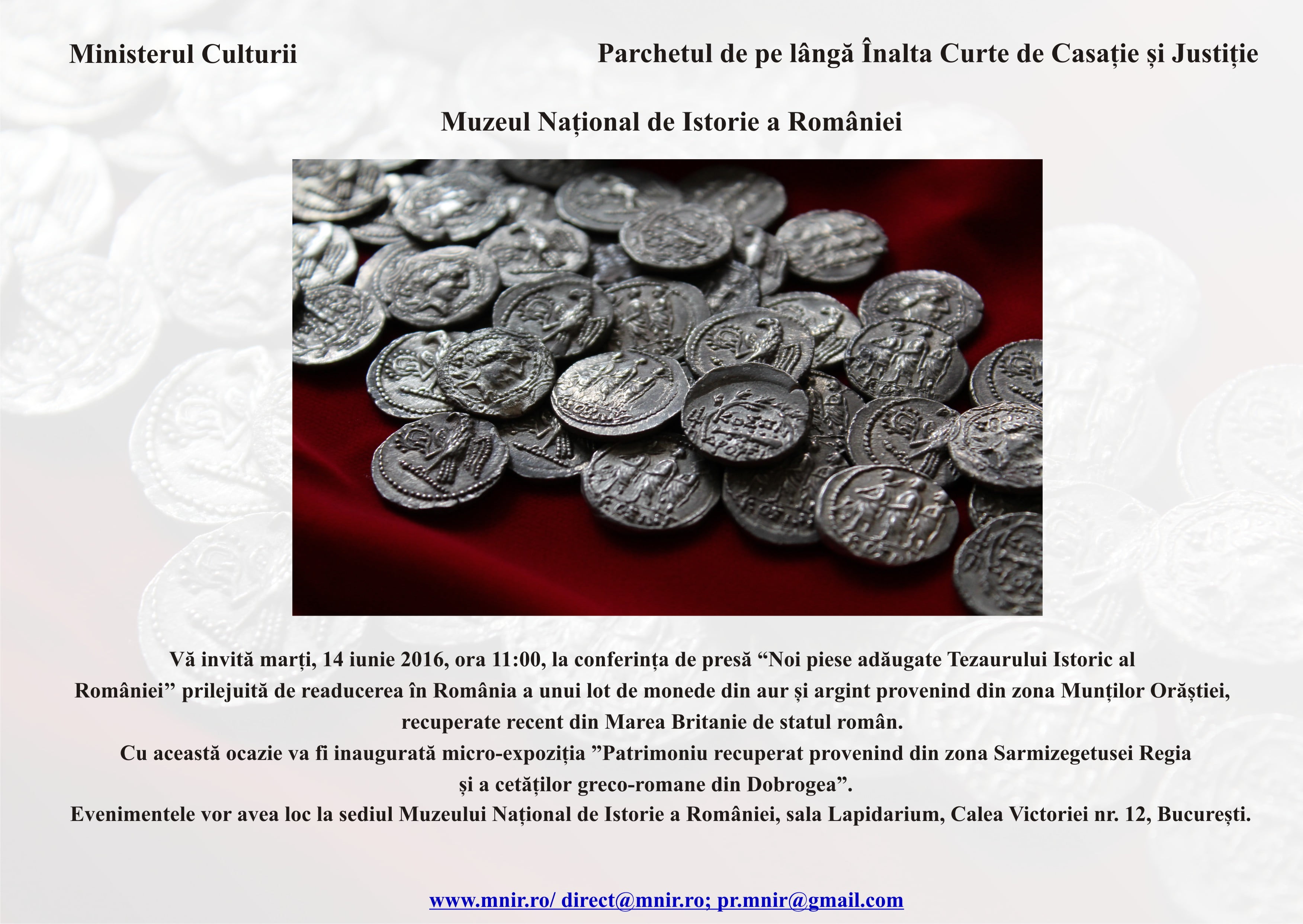 Muzeul Naţional de Istorie a României (MNIR) organizează marți, 14 iunie 2016, începând cu ora 11:00, la sediul său din Calea Victoriei nr. 12, sala...