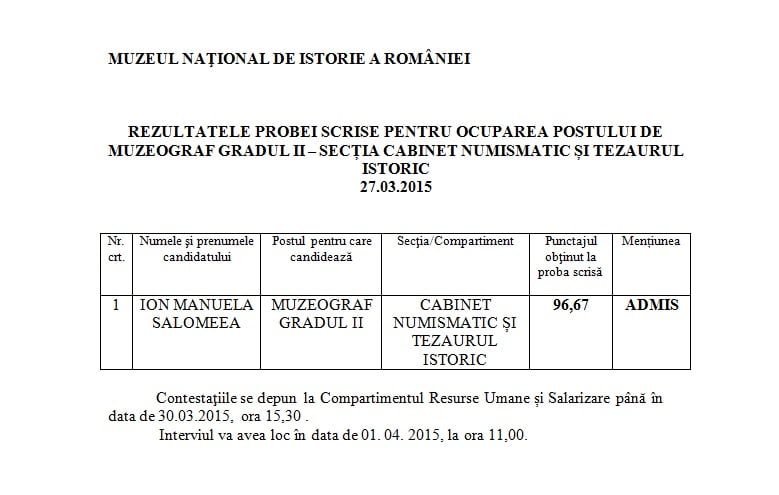 Rezultatele probei scrise pentru ocuparea postului de muzeograf gradul II – 27.03.2015